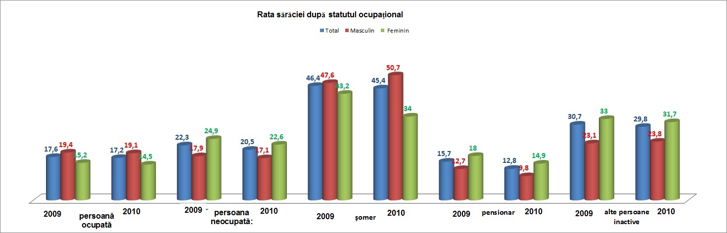 In cadrul persoanelor antrenate intr-o activitate economico-sociala de tip salarial sau pe cont propriu, diferentierile intre sexe sunt destul de clare: un barbat din 5 si respectiv o femeie din 7 au fost sub pragul de saracie. In schimb, la persoanele neocupate si inactive situatia se inverseaza, in sensul ca femeile sunt afectate in mai mare masura de saracie decat barbatii: un