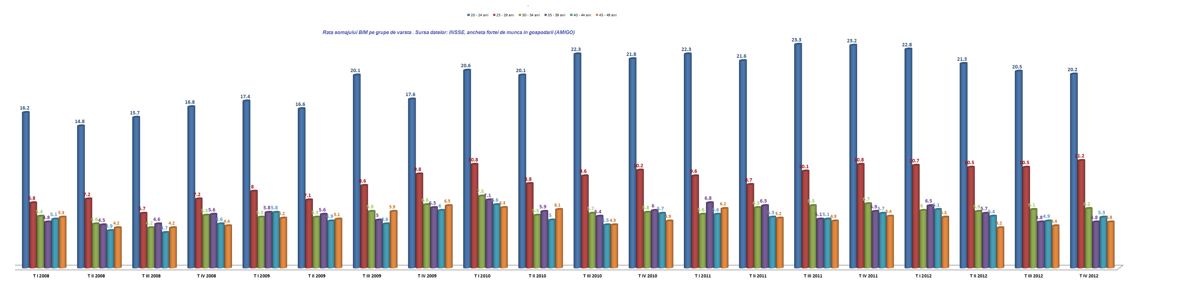 Paranteza. Mai toate categoriile de varsta au avut cresteri ale ratei somajului BIM in perioada 2008-2013 si mai toate au inregistrat cresteri in ultimele trimestre, exceptie facand grupa 35-39 de ani (vezi graficul de mai jos)