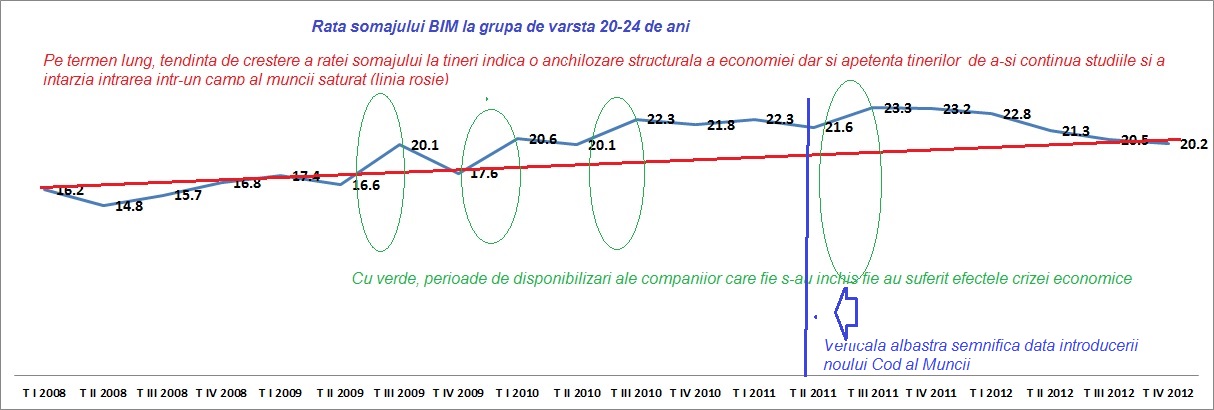 Daca luam ca prim moment al declansarii crizei inceputul anului 2008 (semnele aparusera din toamna lui 2007, mai ales in zona multinationalelor) si ne uitam la evolutia somajului celor cu varsta 20-24 de ani observam o crestere normala in perioada de criza.