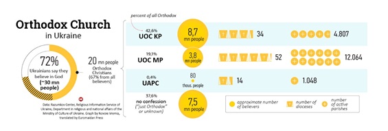 Aceste trei Biserici au aceeași doctrină, dar din punct de vedere administrativ formează entități diferite. Deși BOU MP se mândrea cu cel mai mare număr de parohii și eparhii (12,064 parohii vs. 4,807 ale BOU PK și 1,048 ale BOAU), numărul de credincioși s-a diminuat cu repeziciune. Conform ultimului sondaj din 2018 (Razukov poll)[4], 28,7% dintre ucraineni au spus că aparțin BOU PK (în cifre 8,7 milioane de oameni), iar 12,8% aparțin BOU PM (3,8 milioane de oameni). Un număr semnificativ de oameni – 23,4% – au spus că sunt doar „ortodocși” (7,5 milioane), fără a se identifica în mod special cu o Biserică.
