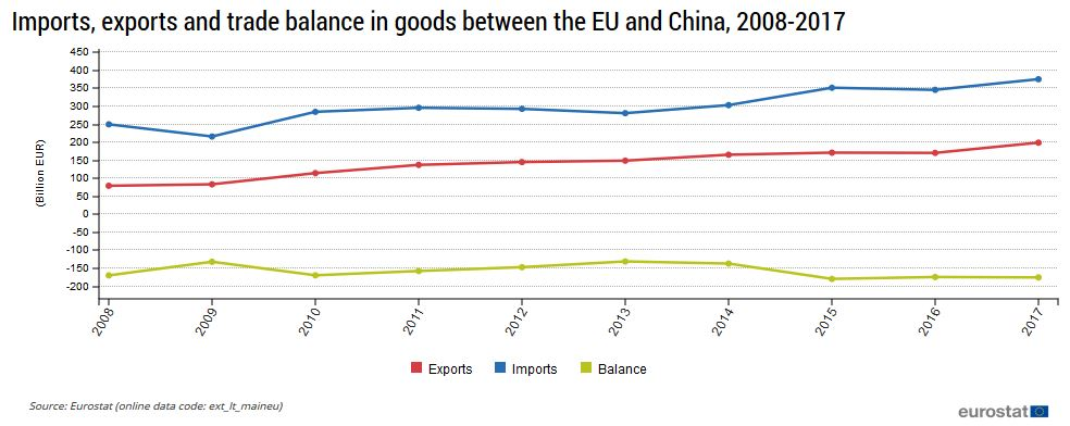 În anul 2017 Eurozona a avut un PIB cumulat mai mare decât cel al Chinei cu mai puțin de 200 de miliarde de dolari. Probabil că, în anul 2018, PIB-ul Chinei ar putea să atingă aproximativ 13.200 miliarde de dolari și l-ar putea depăși pe cel al Eurozonei (anticipat să atingă 12.800 miliarde de dolari) cu peste 400 miliarde de euro, potrivit calculelor Bloomberg[2]. Cu alte cuvinte, China ar putea deveni în 2018 prima economie a lumii. În plus (figura 1), de mulți ani balanța schimburilor comerciale China – UE este favorabilă statului asiatic, așa cum o arată datele publicate de Eurostat[3].