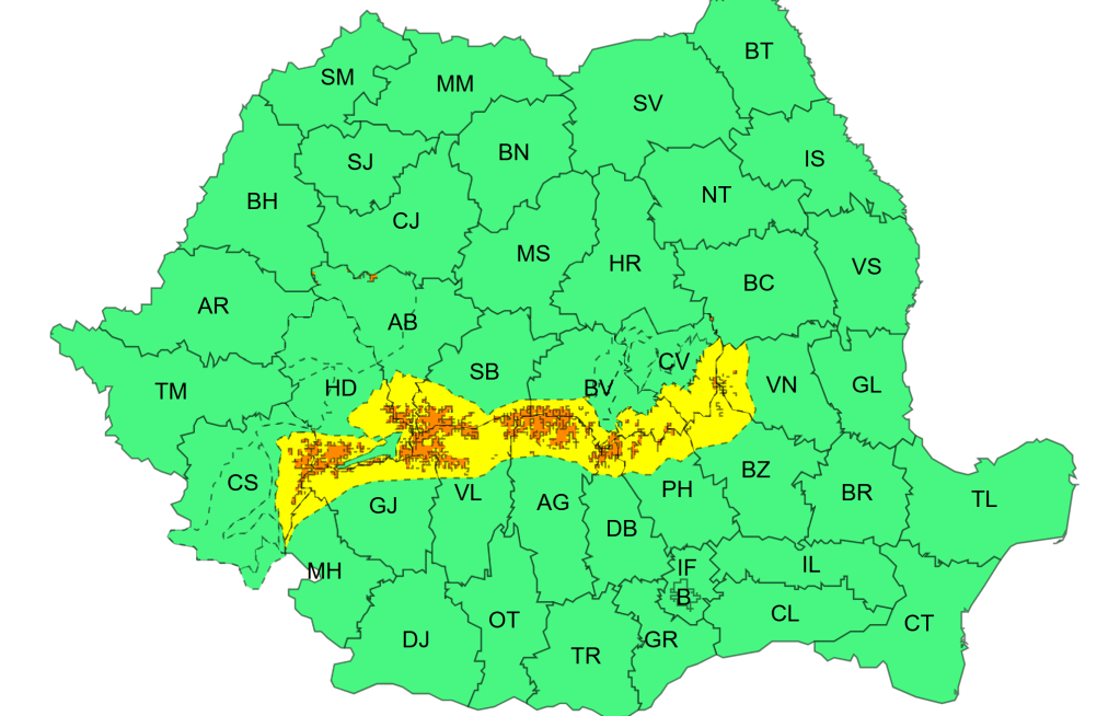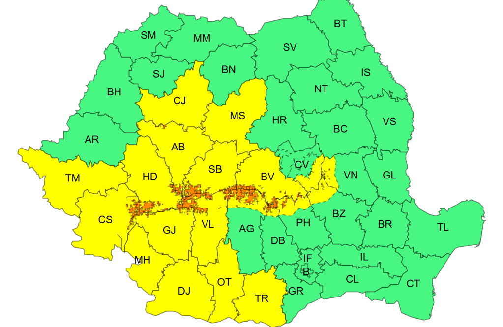 Vizate sunt județe din Carpații Meridionali, Carpații de Curbură și local în Carpații Occidentali, unde vântul va avea intensificări cu viteze de 60…85 km/h, temporar va ninge viscolit și se va depune strat de zăpadă, în medie de 10…15 cm și vizibilitatea va fi redusă sub 100 m.