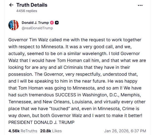Donald Trump a anunțat că a avut o discuție telefonică „foarte bună” cu Tim Walz, guvernatorul statului Minnesota, și că cei doi doresc să colaboreze pentru a îmbunătăți situația din Minnesota.