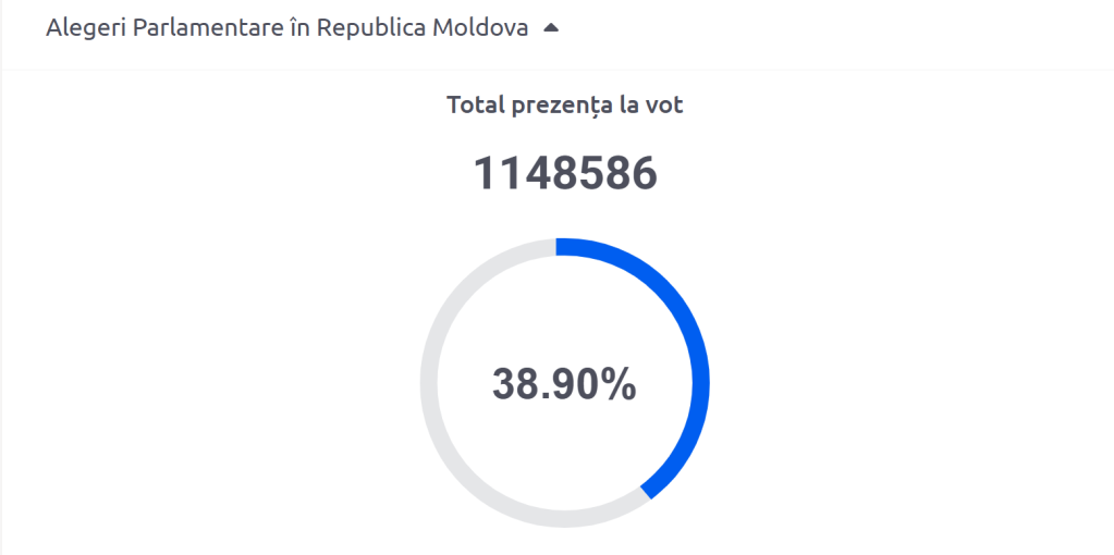 Până la ora 16:00 la alegerile parlamentare de astăzi au votat 1.148.686 de cetățeni (38,9%). Dintre aceștia, 170.448 au votat în diaspora, conform datelor centralizate de autoritățile din Republica Moldova.