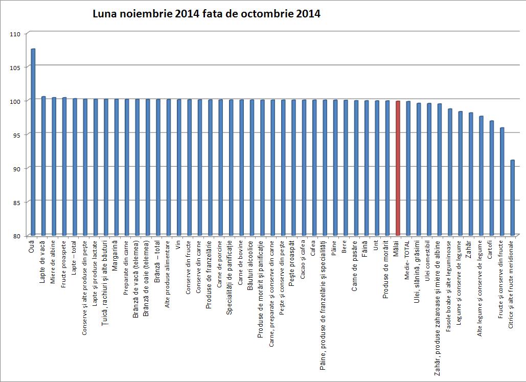 Indicele preturilor de consum (IPC) in luna noiembrie 2014 fata de octombrie 2014 este 99,81%, iar fata de noiembrie 2013 este 101,26%, a comunicat joi Statistica. Indicele armonizat al preturilor de consum (IAPC) din noiembrie 2014 fata de luna precedenta este 99,80%, iar fata de luna corespunzatoare din anul precedent este 101,55%. In luna noiembrie, fata de luna anterioara, preturile marfurilor alimentare si nealimentare au scazut 0,3%, iar tarifele serviciilor au crescut cu 0,2%, se mai arata in comunicatul statisticienilor. Fata de octombrie, cel mai mult s-au sxcumpit ouale, laptele si carnea de peste, dar cresteri de pret au inregistrat si preparatele din carne, confirmand faptul ca Sarbatorile ii fac pe comercianti sa ridice preturile marfurilor de sezon.