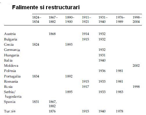 Prima restructurare din istorie a datoriilor autoritatilor publice a avut loc in sec IV i.H.. Rau-platnicul: Grecia, care se imprumutase de la unul dintre cele mai mari centre financiare locale (Templul din Delos) mai mult decat putea duce. Winkler estimeaza imprumutul la 215% din ceea ce am numi astazi PIB-ul cetatilor elene. Intre 1820-2003 au existat sute de restructurari ale datoriilor statelor, foarte putine fiind cele care au scapat de acest lucru. De regula, restructurarile veneau dupa perioade dificile din punct de vedere economic (razboaie, recesiuni, sau pur si simplu imprumuturi de fite, cum au facut cativa regi francezi). Vezi mai jos un tabel cu cateva state si restructurari ale datoriei.