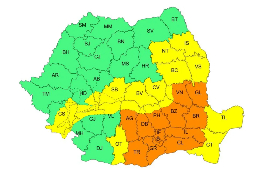Sunt vizate de această avertizare meteo Capitala și 12 județe: Argeș, Teleorman, Dâmbovița, Giurgiu, Ilfov, Prahova, Călărași, Ialomița, Brăila, Buzău, Vrancea și Galați. Alerta expiră miercuri, la ora 12, conform ANM.