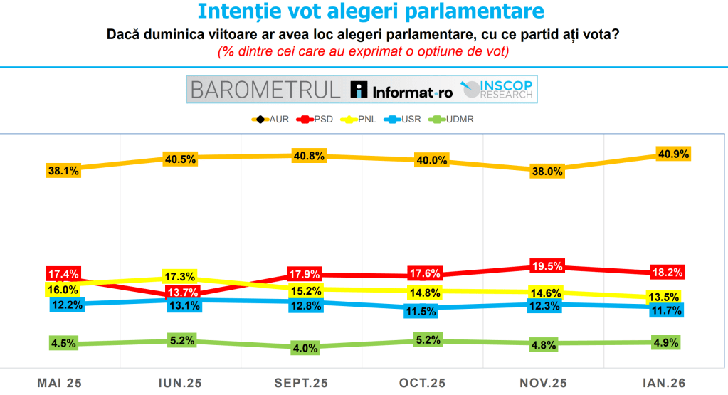 Potrivit sondajului, dacă duminica viitoare ar avea loc alegeri parlamentare, 40,9% dintre români ar vota pentru AUR. La precedentul sondaj INSCOP, din noiembrie 2025, AUR era creditat cu 38%.