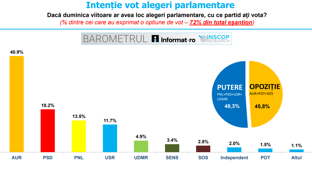 AUR, partidul condus de George Simion, conduce detașat în intenția de vot la alegerile parlamentare, potrivit unui sondaj realizat de INSCOP Reseach, publicat miercuri. Partidele aflate la guvernare, luate împreună, au un ușor avantaj.