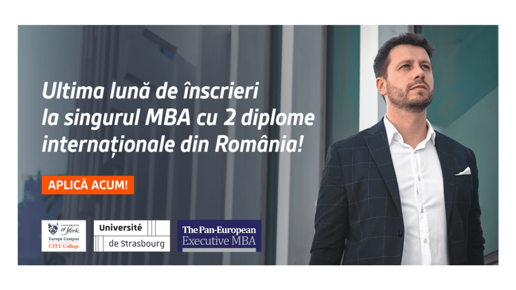 Last call pentru înscrieri: programul Pan-European Executive MBA cu dublă diplomă internațională începe pe 14 noiembrie Articol susținut de CCollege OCT. '24 Last call pentru înscrieri: programul Pan-European Executive MBA cu dublă diplomă internațională începe pe 14 noiembrie