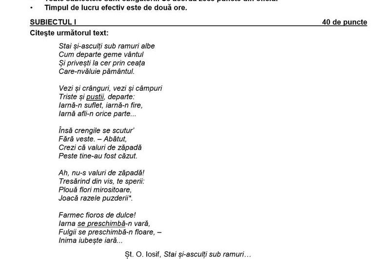 Mai exact, subiectul în cauză implică strict noțiuni de vocabular, punctuație, gramatică – morfologie, sensul cuvintelor, respectiv apartenența la genul liric (poezie) a textului.