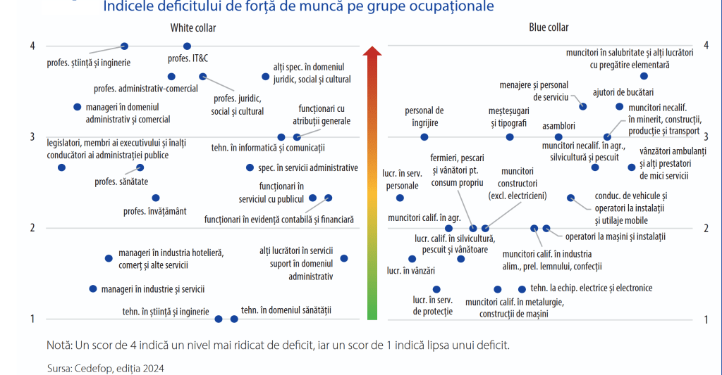 Starea pieței forței de muncă – între structură și ciclicitate: Analizând pe grupe ocupaționale, deficitul este maxim în zona locurilor care cer competențe elementare (muncitori necalificați, manipulare, curățenie, ajutoare), dar și pe domeniile de vârf: IT, inginerie, sănătate. Un paradox: la noi, segmentul tehnic cu o calificare medie pare ceva mai puțin deficitar, cu variații regionale importante.