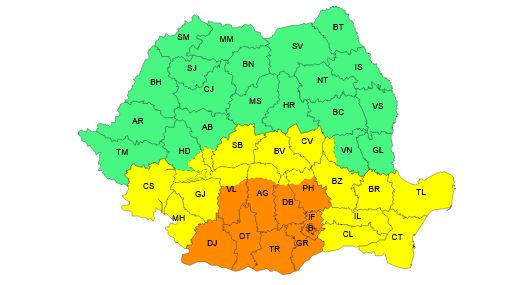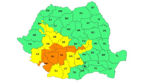 O avertizare cod portocaliu de precipitații importante cantitativ, iar la munte viscol puternic, este valabilă în intervalul 28 martie, ora 10 – 29 martie, ora 12, în judeţele Mehedinţi, Gorj şi Vâlcea şi în zona de munte a judeţelor Caraş-Severin, Hunedoara, Alba, Sibiu, Braşov şi Argeş va ploua abundent.