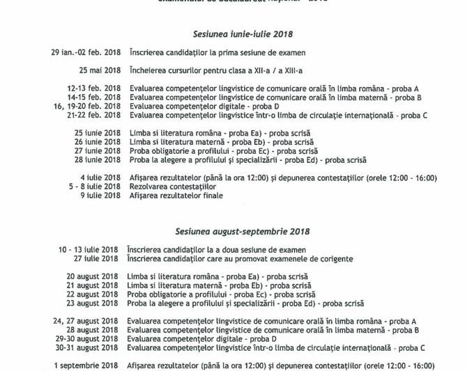 Inscrierile pentru sustinerea examenului in prima sesiune se fac in saptamana 29 ianuarie – 2 februarie 2018. Cursurile pentru clasele a XII-a si a XIII-a se incheie vineri, 25 mai.