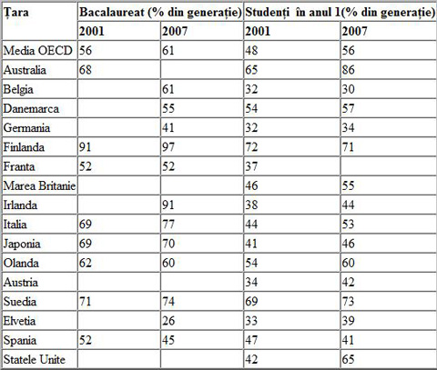 Diferentele sunt enorme, de la sisteme cu numai o treime dintr-o generatie care isi continua studiile, cum sunt Belgia, Germania sau Elvetia pana la peste 70% cum sunt Finlanda sau Suedia, de altfel tari cu pozitii fruntase in studiile comparative gen PISA, TIMSS, PIRLS, etc. Ce se mai vede din tabel este ca ponderea medie la nivelul OECD a crescut, de la 56% in 2001 la 61% in 2007.