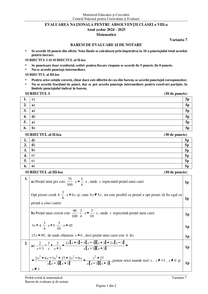 Descărcați Baremul de corectare la Matematică Evaluarea Națională 2025: