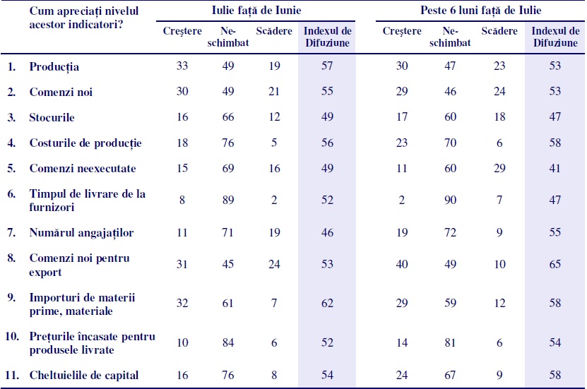 De altfel, starea de spirit a managerilor este destul de deprimata. Indicatorul de incredere in situatia economica viitoare a firmei a scazut de la 56 in iunie, la 53 in iulie. Increderea se topeste. Pentru comparatie, in luna ianuarie indicatorul de incredere avea 68 de puncte. Valoarea indicatorului reprezinta media asteptarilor privind rata comenzilor noi, a volumului productiei si a preturilor pe care ar putea sa le incaseze firmele peste 6 luni. Cererea slaba, volatilitatea, incertitudinile globale, obligatiile financiare curente afecteaza nu numai activitatea prezenta, ci si increderea firmelor in viitor.