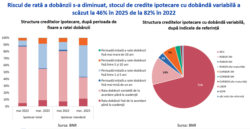 În cazul celor din urmă, o proporție importantă a creditelor CRE- acronimul Commercial Real Estate (94% la sută, septembrie 2024) este expusă la riscul de rată a dobânzii, fiind acordată cu dobândă variabilă de la acordare până la scadență. Dintre acestea, 34 la sută au ca indice de referință EURIBOR la 3 luni și alte 30 la sută ROBOR la 3 luni. Doar 4 la sută din volumul creditelor CRE este acordat cu dobândă fixă de la acordare până la scadență.