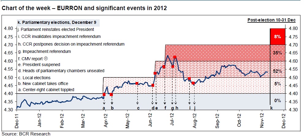 Probabilitatea ca leul sa ramana in intervalul 4,5-4,6 in fata monedei europene este de 52%, se arata intr-un raport al echipei de la Departamentul Cercetare al BCR. Potrivit economistilor citati, in functie de rezultatul alegerilor si de evenimentele care vor urma, exista o probabilitate de 8% ca leul sa ajunga la 4,80 si 35% ca moneda nationala sa se tranzactioneze in intervalul 4,6-4,7/EUR. Economistii BCR coteaza cu 0% sansele ca leul sa coboare sub 4,4 unitati in fata euro