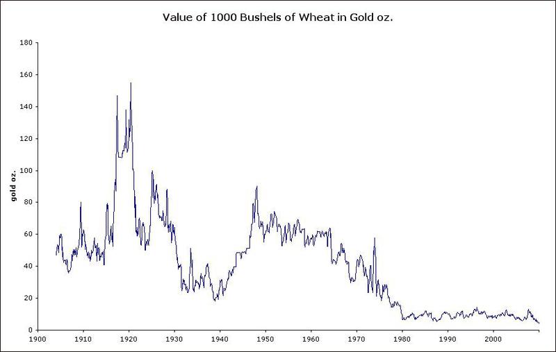 Pretul graului in aur (1900-2010). De aici. Situatia e similara si in cazul porumbului. Nici pretul energiei, nici pretul granelor nu sunt, exprimate in aur, la cote nemaivazute, ba dimpotriva.