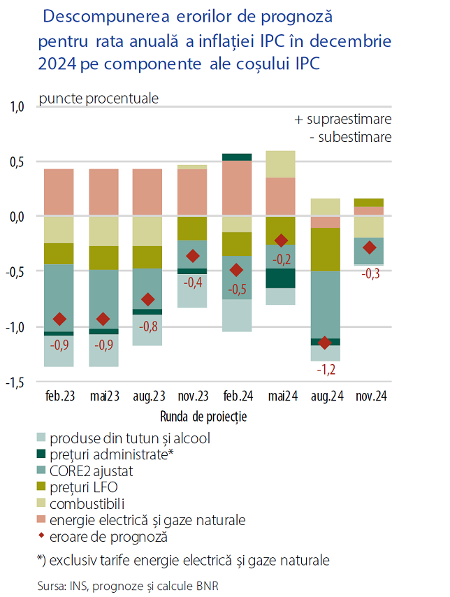 „Tendința de subestimare a caracterizat atât indicele CORE2 ajustat (inflația pe care BNR o poate efectiv controla prin intermediul politicii monetare), cât și ansamblul componentelor exogene ale coșului de consum (prețurile combustibililor, tarifele la energie și gaze sau nivelurile accizei la tutun-n.a.), deși, în structura acestora din urmă, au existat și indici a căror dinamică a fost supraestimată”, mai arată analiza citată.