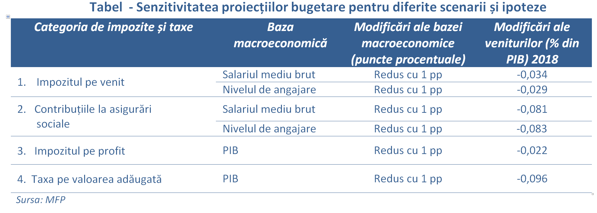 În condițiile în care încasările din impozite și taxe sunt strâns corelate cu evoluția ratei de ocupare în economie, a câștigului mediu și creșterea economică, în tabelul următor se prezintă impactul asupra veniturilor bugetare a variației variabilelor economice considerate independente, având ca bază anul 2017.
