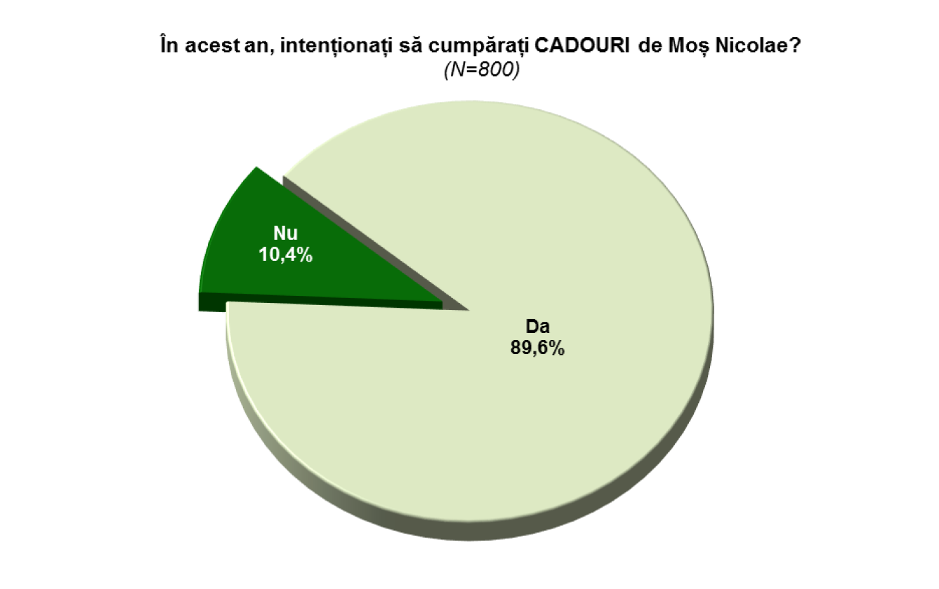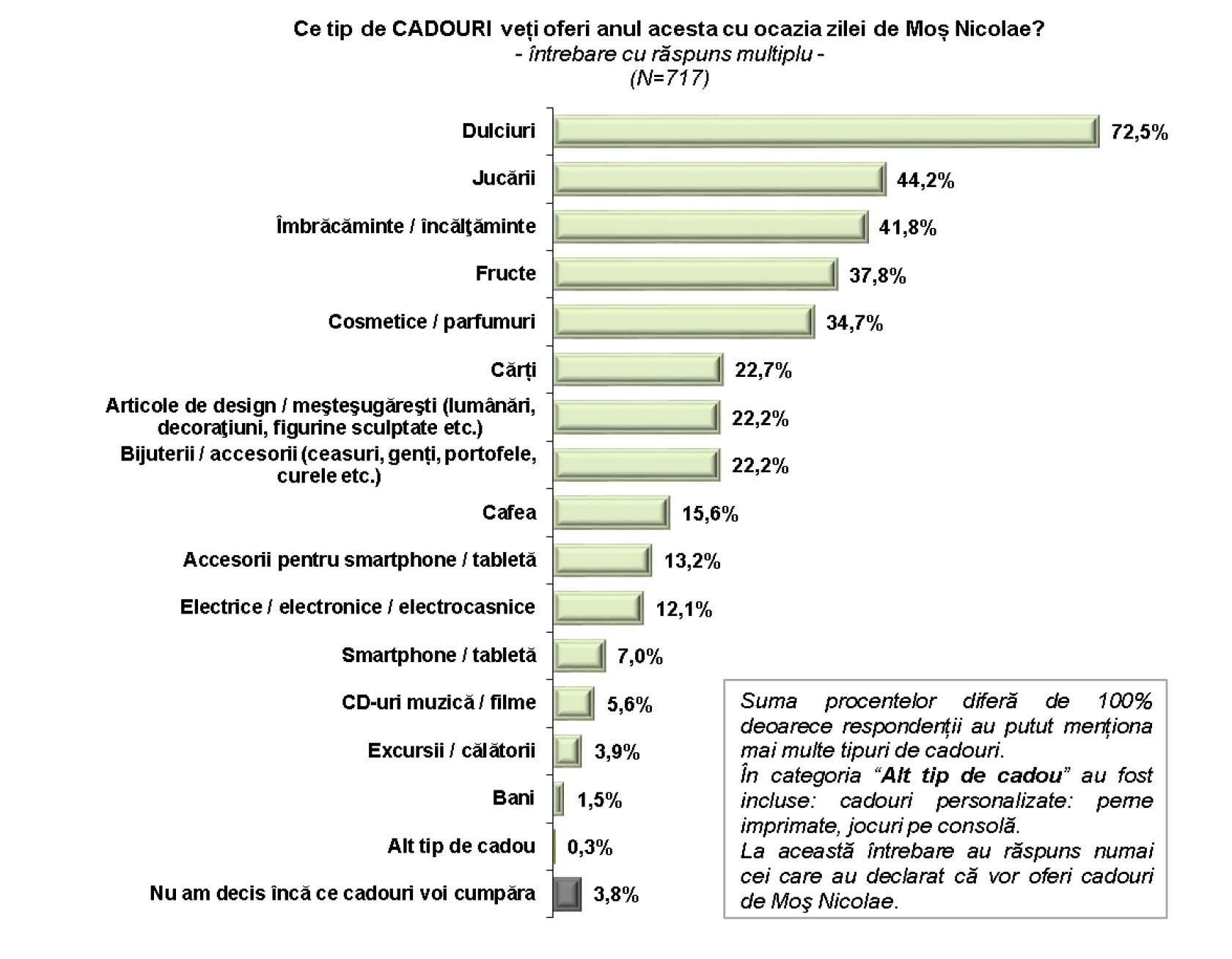 Conform datelor celui mai recent studiu de piață realizat de către MEDNET Marketing Research Center, 89,6% dintre persoanele din mediul urban intenționează să cumpere cadouri de Moș Nicolae pentru cei dragi. Și în acest an, cadourile preferate rămân dulciurile (72,5%), urmate de jucării (44,2%) și de articole de îmbrăcăminte/încălțăminte (41,8%). De asemenea, se vor oferi și fructe, cosmetice/parfumuri sau cărți. Pe lângă acestea, au mai fost menționate articole de design, bijuterii și accesorii, cafea și accesorii pentru smartphone/tabletă. Cei care nu au avut suficient timp să achiziționeze toate cadourile sau nu l-au găsit pe cel mai potrivit, vor oferi și bani (1,5%).