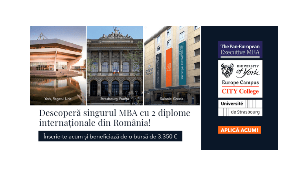 CITY College, University of York Europe Campus oferă o oportunitate unică pentru cei care doresc să-și potențeze cariera printr-un program MBA de elită, menit să extindă orizontul cunoștințelor de business și să ofere posibilități de networking la nivel internațional. Până la sfârșitul lunii iunie există posibilitatea de a obține o bursă în valoare de 3.350 euro pentru programul The Pan-European Executive MBA. Înscrierile sunt deschise, iar formularul de aplicare este disponibil aici.