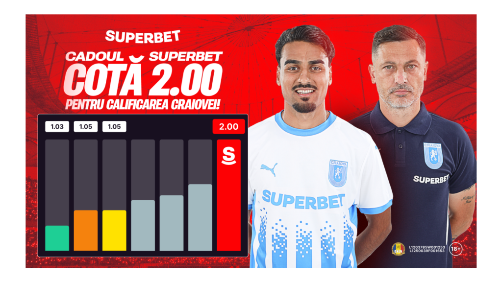 Superbet, liderul pieței de tech & entertainment din România și sponsor oficial al Universității Craiova din vara lui 2025, face un nou pas uriaș pentru industria pariurilor sportive din România: miercuri și joi, găsești pe site și în aplicația Superbet, dar și în toate agențiile din țară, o cotă specială de 2.00 (mărită de la 1.04) pe calificarea Universității Craiova în play-off-ul Conference League.