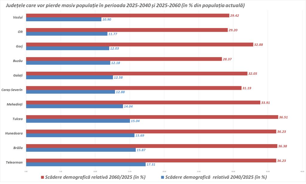 Dar declinul nu va fi uniform: sudul țării se prăbușește demografic, în timp ce centru, nord-vestul și zona metropolitană București-Ilfov rămân relativ stabile.