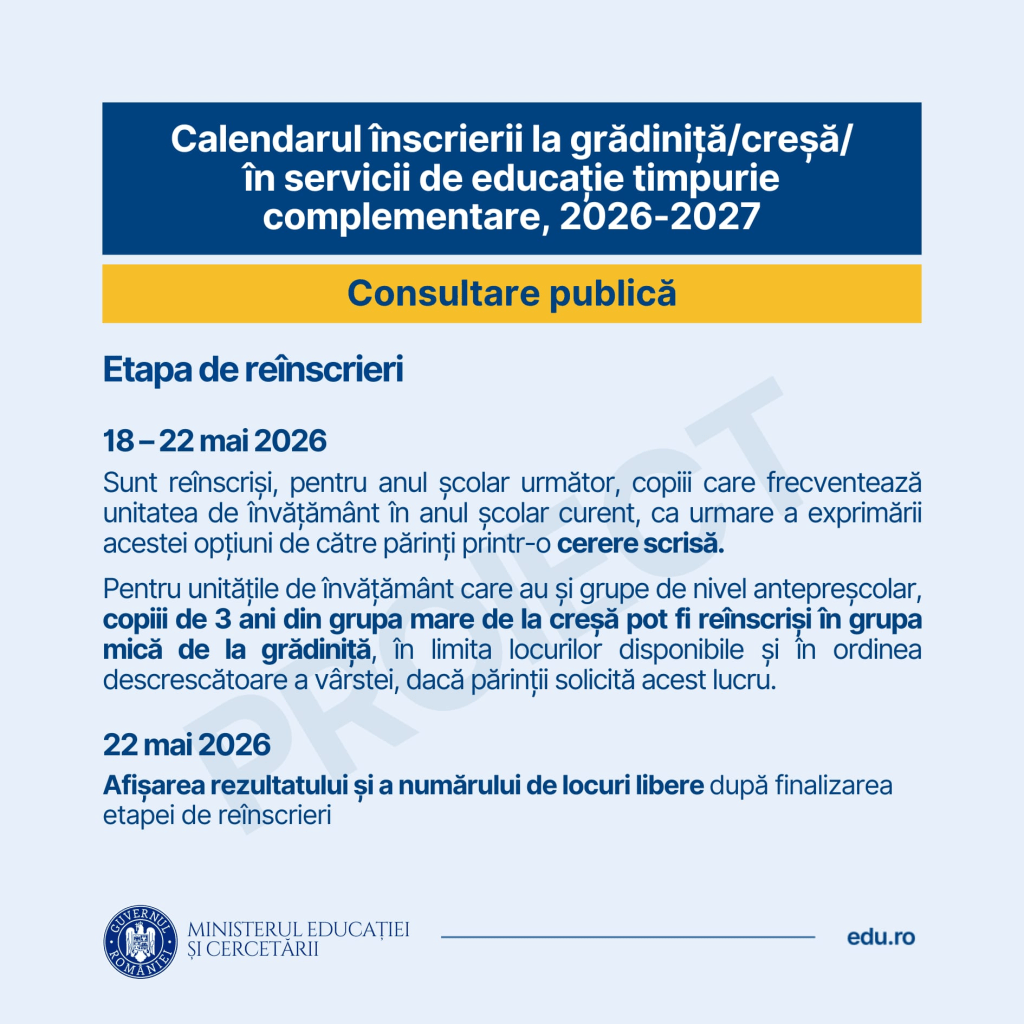 Prima etapă a procesului este cea de reînscrieri, programată între 18 și 22 mai 2026. În acest interval, părinții copiilor care frecventează deja o creșă sau o grădiniță trebuie să își exprime opțiunea ca aceștia să continue în aceeași unitate de învățământ și în anul școlar următor, prin depunerea unei cereri.