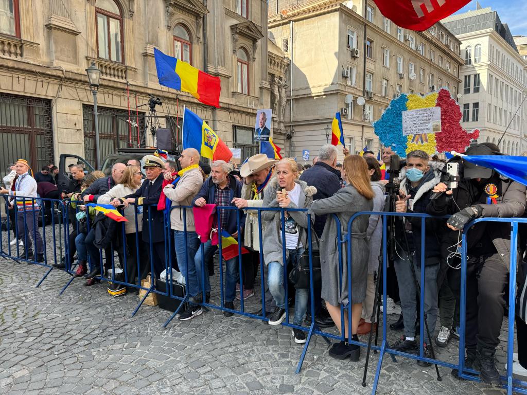 „Un participant la manifestație a escaladat gardul care delimitează sediul Băncii Naționale a României. În acest moment, persoana refuză să coboare și să coopereze cu forțele de ordine”, transmite Jandarmeria București. Potrivit imaginilor de la fața locului este vorba de Cezar Avrămuță, cunoscut ca „Steagarul Dac”, o prezență constantă la protestele din ultimii ani din București.