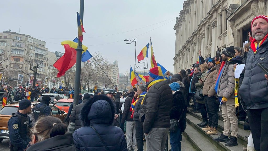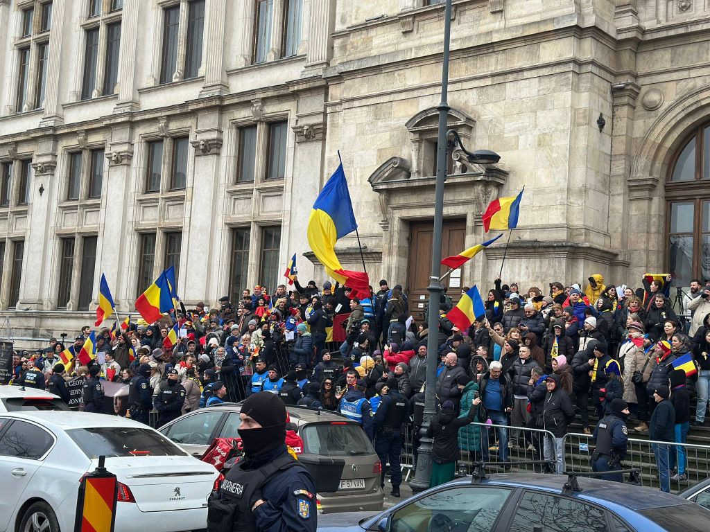 Pe treptele CAB se află sute de susținătători, care strigă „Călin Georgescu este președinte”.