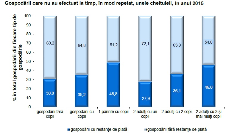 • Una din trei familii au prezentat restante repetate la plata utilitatilor si intretinere, cauzate in principal de lipsa banilor. Dintre platile pentru care s-au inregistrat restante in cursul anului 2015, cele mai frecvente cazuri au fost la energia electrica (54,6% din gospodariile cu restante), intretinerea locuintei (53,2%) si abonamentul telefonic (34,1%). Ponderi reduse s-au inregistrat la restantele pentru rate la imprumuturi1 (9,1%), explicabil prin specificul acestor tipuri de plati care sanctioneaza mai sever nerespectarea termenelor de plata. Familiile de someri se afla in situatia cea mai dificila, ponderea celor care nu si-au putut plati la timp sumele datorate fiind de 49,3%, proportie mai mare fata de celelate categorii de gospodarii. Fenomenul restantelor este de asemenea mai raspandit in cazul gospodariilor cu copii si mai ales al celor monoparentale (48,8%) sau in cazul gospodariilor de 2 adulti cu 3 sau mai multi copii in intretinere (46,0%).