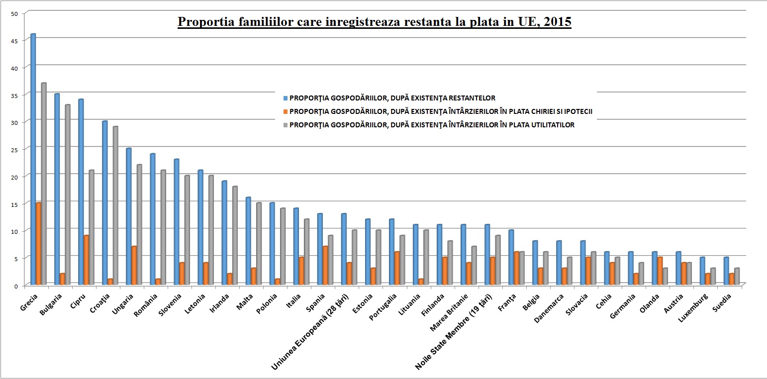 Anul trecut, Romania a inregistrat a doua crestere economica din UE de 3,8%, fiind vicecampionii performantei economice, dupa Slovacia. Cu toate acestea, o cercetare publicata miercuri de INS, referitoare la nivelul calitatii vietii, arata o situatie deloc imbucuratoare. De pilda, una din trei familii au avut restante repetate la plata utilitatilor si intretinere, cauzate in principal de lipsa banilor. Cele mai frecvente restante au fost la energia electrica (54,6% din gospodariile cu restante), intretinerea locuintei (53,2%) si abonamentul telefonic (34,1%). Vezi in text 15 aspecte esentiale legate de calitatea vietii in Romania anului 2015 si citeste in final lucrarea INS.