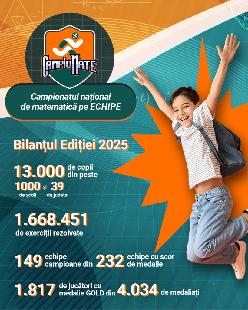 În spatele acestor cifre sunt sute de profesori și antrenori pasionați, liceeni-voluntari dedicați și o întreagă comunitate de părinți, parteneri și suporteri care au înțeles că matematica nu înseamnă doar calcule, ci strategie, perseverență, coordonare, spirit de echipă și, mai ales, bucurie. Pentru elevii-jucători și toți cei implicați, finalul Ediției 2025 vine cu un adevărat festival de Gale în cadrul cărora comunitatea CampioMATE își sărbătorește atleții minții și campionii: Gala națională, pe 31 mai, online, urmată de mai multe evenimente offline, locale, coordonate de Inspectoratele școlare județene în Călărași, București, Ilfov, Constanța, Bistrița-Năsăud, Iași, Alba, Bacău, Prahova, Teleorman, Arad, Suceava, Vrancea și alte județe până la vacanță.