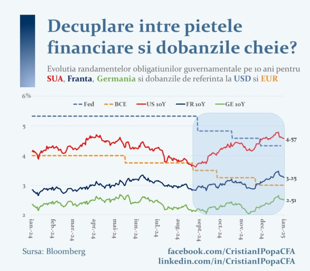 La începutul anului 2024, piețele anticipau o politică monetară mai relaxată, cu mai multe reduceri ale ratelor dobânzilor, ceea ce s-a materializat doar parțial. În prezent, percepția investitorilor este că politica monetară va rămâne mai restrictivă. Piețele au virat de la optimism spre pesimism.