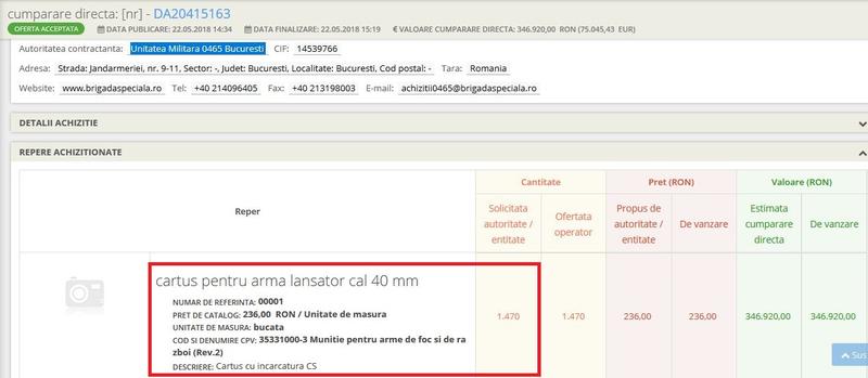 Contract în valoare de 105.350 lei (peste 22.500 euro). Achiziție directă făcută în data de 23 aprilie 2018 de la compania ROMARM.