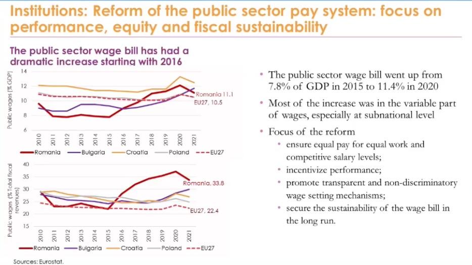 „Cred că este important să stimulăm performanța, adică să legăm remunerarea de performanța colectivă și individuală. Este important, de asemenea, să promovăm un mecanism de salarizare transparent și nediscriminatoriu. Este important să avem reguli pentru stabilirea salariilor pentru promovare, creștere și așa mai departe. Apoi, să asigurăm sustenabilitatea cheltuielilor salariale pe termen lung”, a mai afirmat economistul Băncii Mondiale.