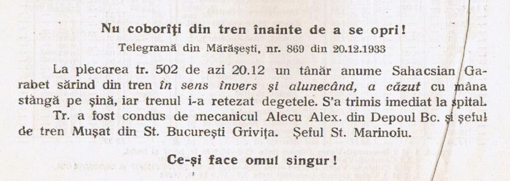 În Mersul din 1934 erau incluse și mici texte (așa zise telegrame) despre ce se întâmplă când nu respecți regulile lângă liniile de cale ferată. Iată un exemplu, cu ortografia de acum 91 de ani: