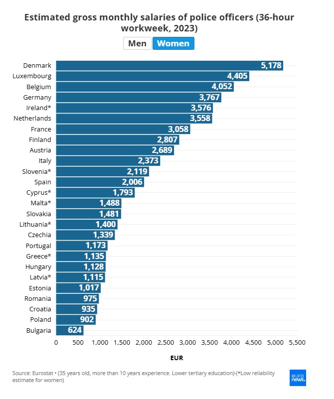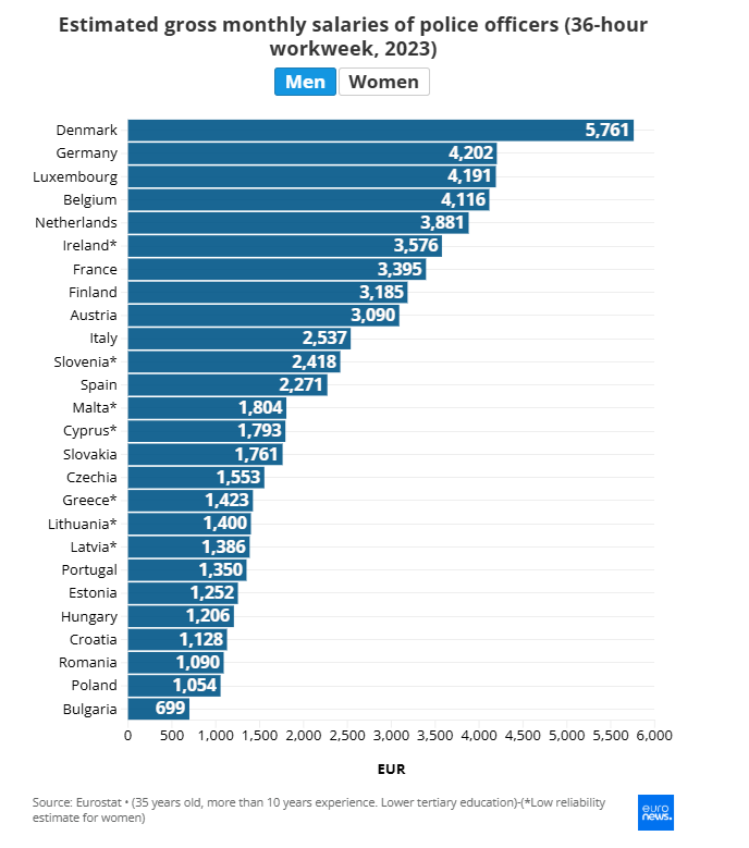 În 2023 existau doar patru țări UE în care ofițerii de poliție primeau salarii brute de peste 4.000 de euro pe lună. Danemarca este urmată în ierarhie de Germania, Luxemburg și Belgia, toate cu salarii de circa 4.200 de euro.