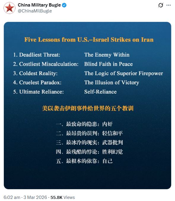 Într-o postare neașteptată, pe contul oficial de X al forțelor militare ale Chinei, armata chineză spune că a învățat cinci lecții din atacul SUA – Israel contra Iranului. „Cea mai costisitoare eroare de calcul: credința oarbă în pace”, este una dintre lecții, enunțate sec de China, fără niciun comentariu.