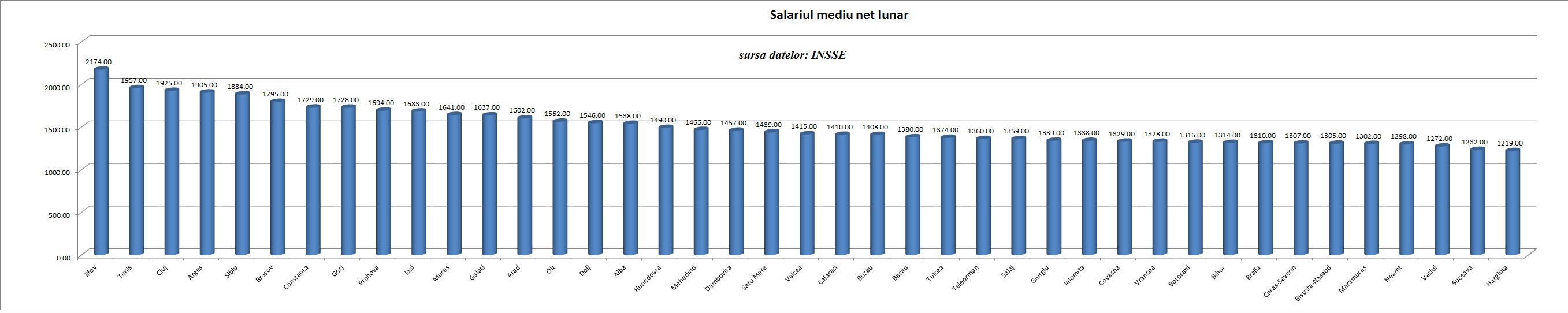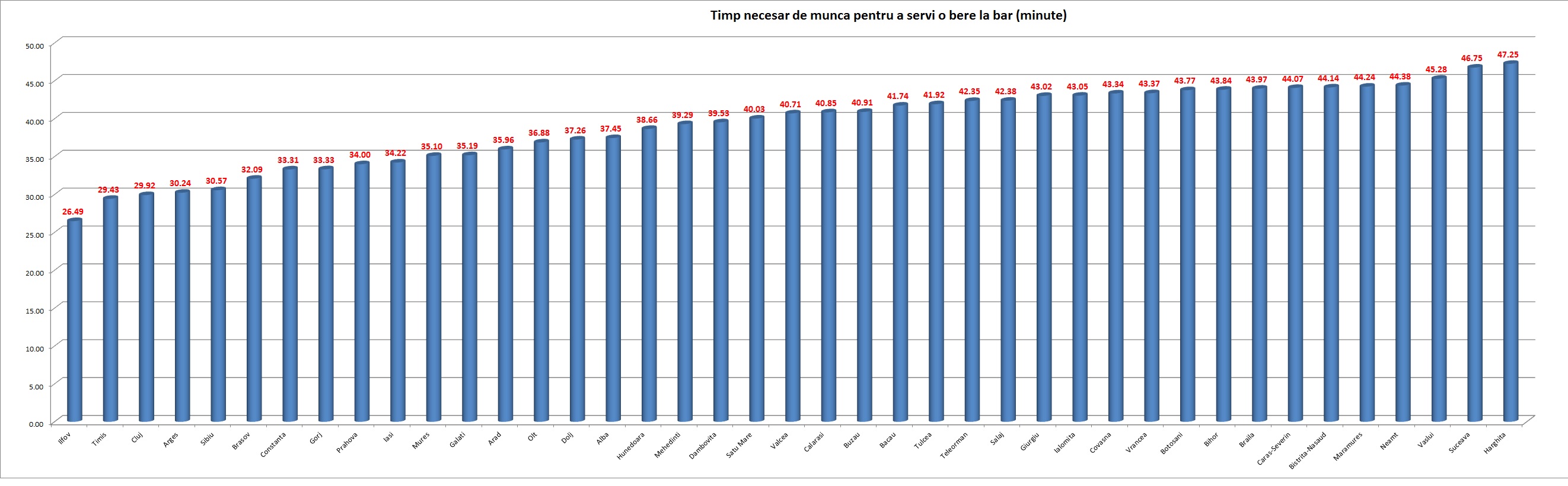 La polul opus se afla Neamtul, Vasluiul, Suceava si harghita, care lucreaza in medie trei sferturi de ora ca sa isi permita o bere intr-un restaurant local.