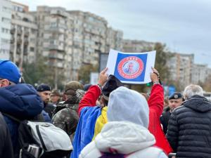 Un grup mic de persoane se plimbă prin mulțime cu pancarte pe care scrie „Free Călin Georgescu”.