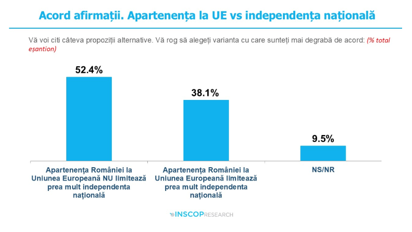 Aproximativ 52% dintre români sunt de părere că apartenența României la UE nu limitează prea mult independența națională, în timp ce 38,1% sunt de părere că apartenența României la UE limitează prea mult independența națională, potrivit unui sondaj de opinie INSCOP Research la comanda think-tankului Polithink pe teme de politică externă și digitalizare.