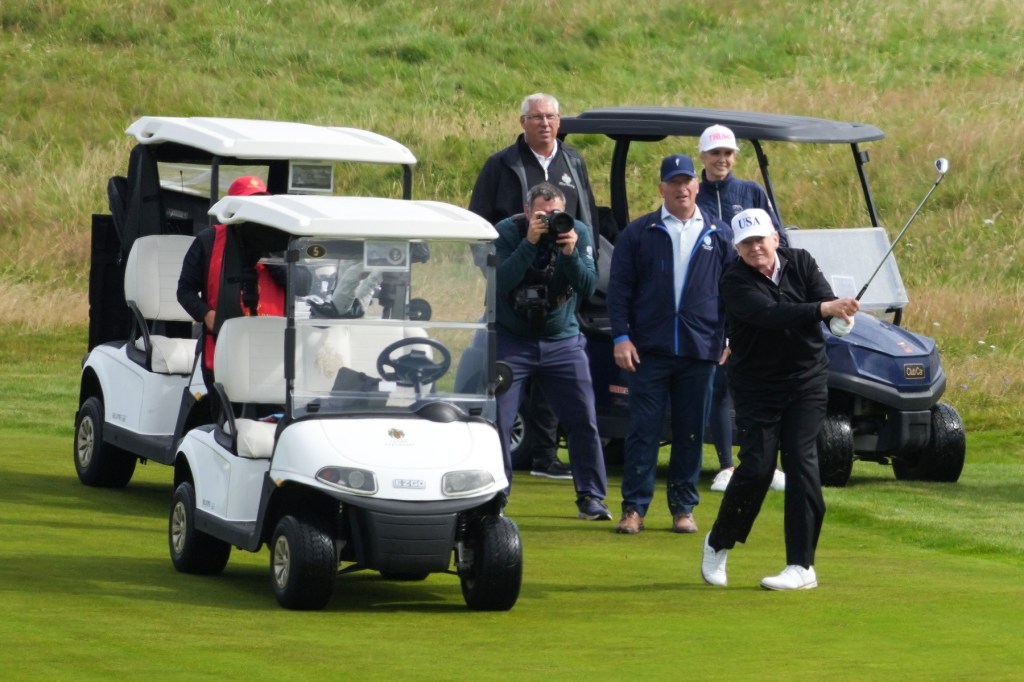 Purtând o șapcă albă inscripționată cu „SUA”, președintele american a salutat din mașina de golf ziariștii după ce a ajuns pe teren în jurul orei 10:00 GMT, însoțit de mai mulți consilieri.