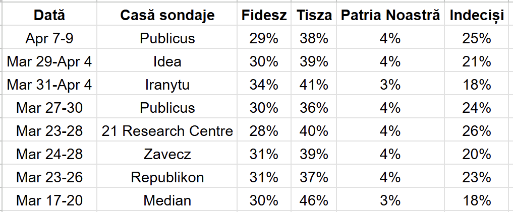 Ce scoruri arată ultimele opt sondaje din Ungaria: