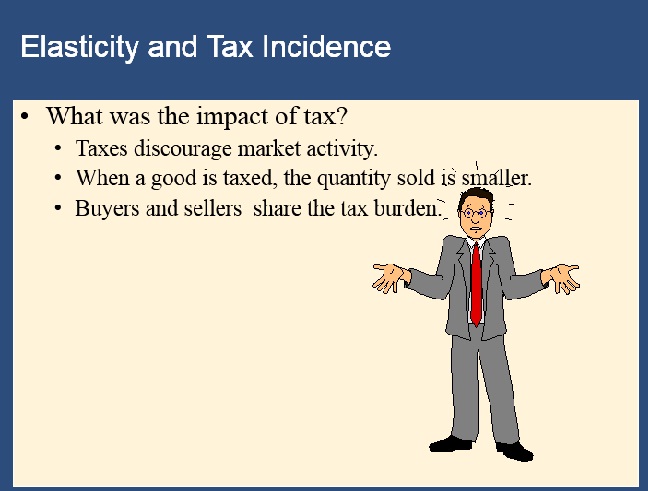 Povara impozitarii se reflecta in doua elemente: (1) scaderea ofertei, ceea ce duce la scaderea cantitatii tranzactionate; astfel, consumatorii au de suferit fiindca nu-si mai pot procura la fel de multa benzina ca inainte. (2) scumpirea produsului, care depinde de elasticitatea cererii si a ofertei; cu alte cuvinte, cumparatorii vor cumpara benzina mai putina SI mai scumpa.