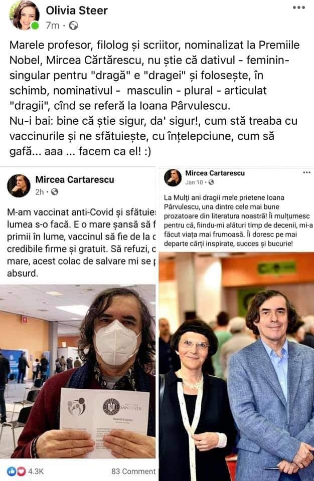 „Marele profesor, filolog și scriitor, nominalizat la Premiile Nobel, Mircea Cărtărescu, nu știe că dativul – feminin – singular pentru „dragă” e „dragei” și folosește, în schimb, nominativul – masculin – plural – articulat „dragii”, când se referă la Ioana Pîrvulescu. Nu-i bai: bine că știe sigur, da’ sigur!, cum stă treaba cu vaccinurile și ne sfătuiește, cu înțelepciune, cum să gafă… aaa… facem ca el! :)”, a scris Olivia Steer, potrivit capturii de ecran publicată pe pagina lui Cărtărescu.