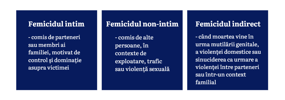 Aceste categorii includ: femicidul comis de partener sau fost partener, femicidul familial, femicid sexual, femicidul social sau comunitar și femicidul prin conexiune.